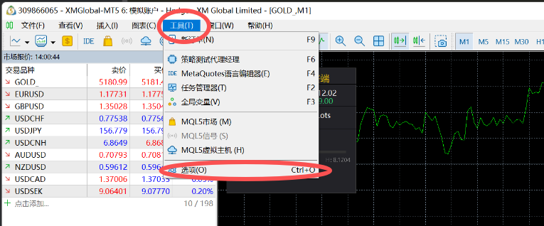 1. 打开MT5,点击菜单栏「工具」→「选项」