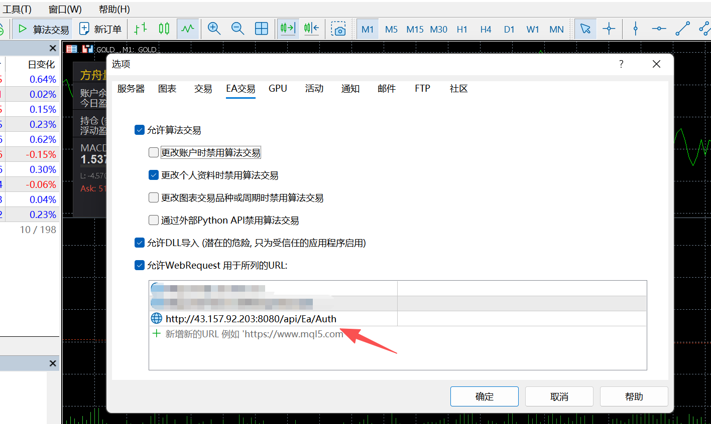 2. 切换到「EA交易」选项卡,勾选「允许WebRequest对以下URL发出请求」,并添加授权地址: